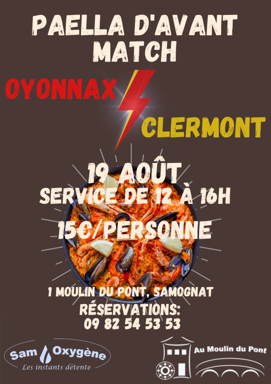 Afin de fêter le retour d'Oyonnax dans l'élite du rugby français, l'hôtel restaurant Au Moulin du Pont à SAMOGNAT propose, à l'occasion du premier match en TOP 14 de la saison contre le voisin clermontois, une paella ce samedi midi.