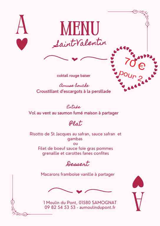 La fête des amoureux approche, vous souhaitez passer un agréable moment en compagnie de votre valentine ou votre valentin, nous avons un atout pour vous : notre menu spécial Saint Valentin du vendredi 14 février 2025 au soir, concocté de main de maitre par notre chef de cuisine.